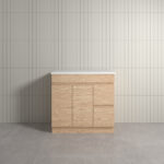 Thebe Floor Mount Soft Oak Vanity With Natural White Stone Top 900mm Right Hand Drawer