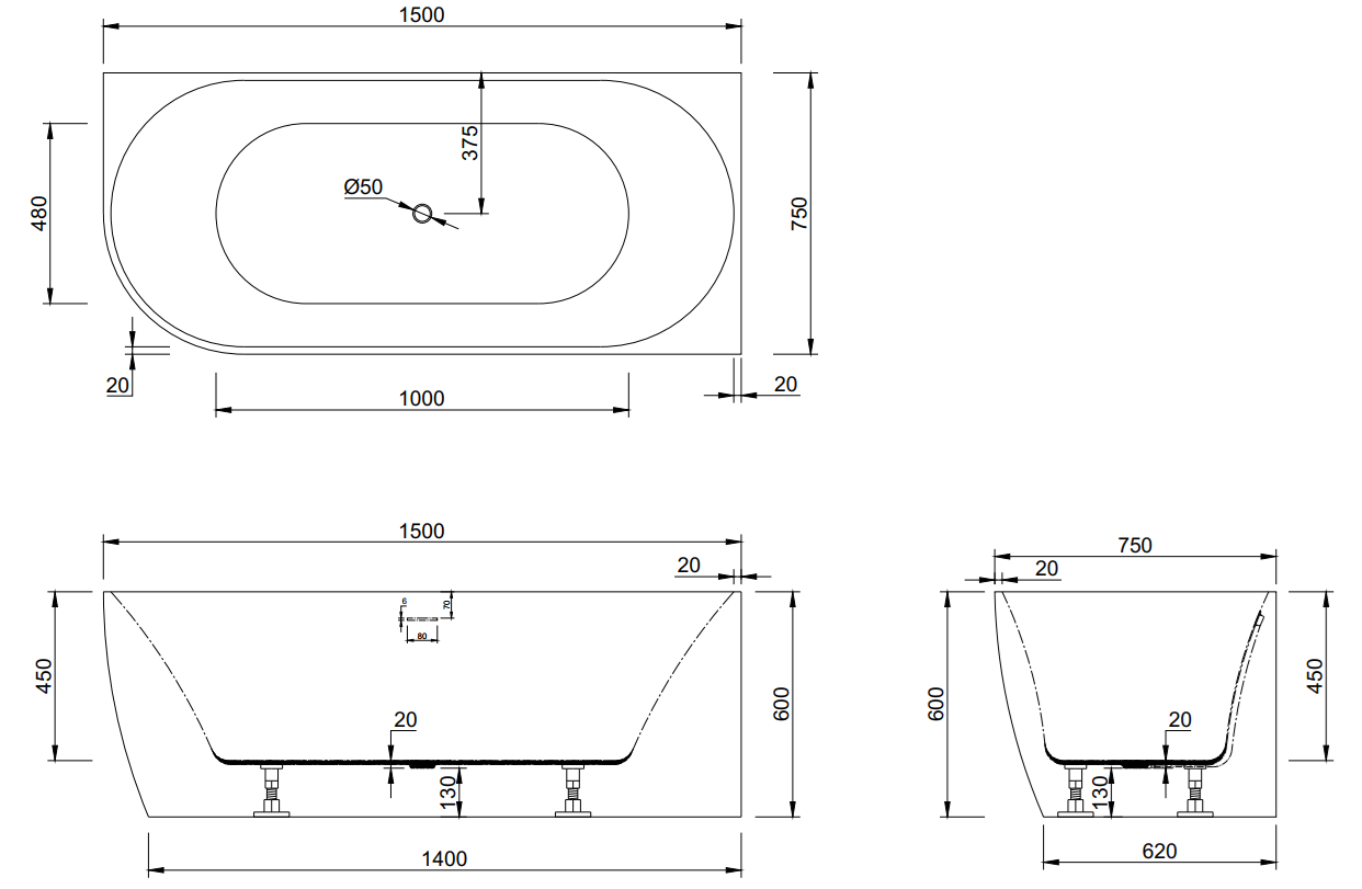 Versa MK2 1500mm White RH Multi Fit Corner With Overflow BTW Freestanding Bath